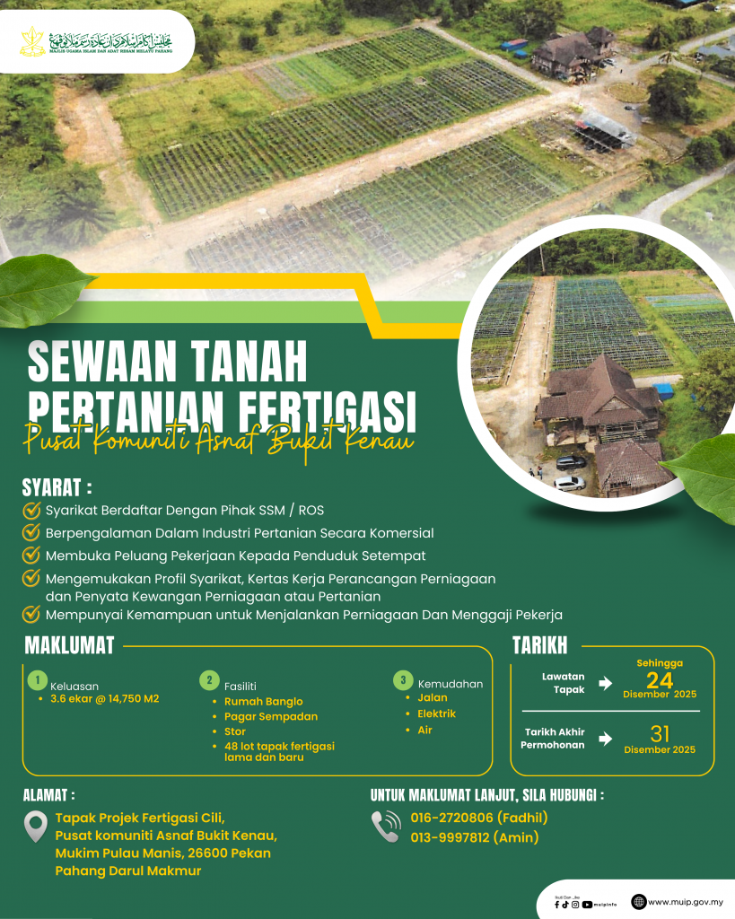 Sukacita dimaklumkan bahawa satu (1) tapak pertanian fertigasi di bawah pengurusan Majlis Ugama Islam dan Adat Resam Melayu Pahang (MUIP) dibuka untuk tujuan sewaan. Maklumat adalah seperti berikut: